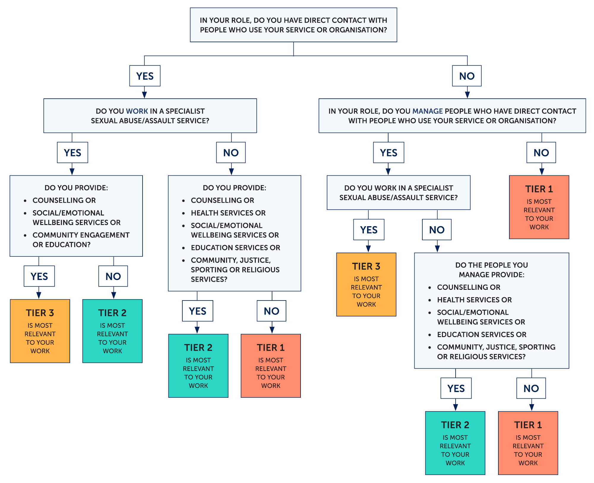 The decision tree below has been designed to assist you to consider which tier best fits the work that you do. Each tier has a specific set of knowledge and skills appropriate to your current role and the purpose of your organisation.